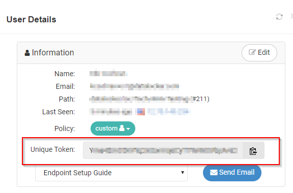 - The User's Unique Registration Token can be found by going to Manage Users and clicking the blue pop-out box ahead of the User's name (SafeConsole 5.2.3+)